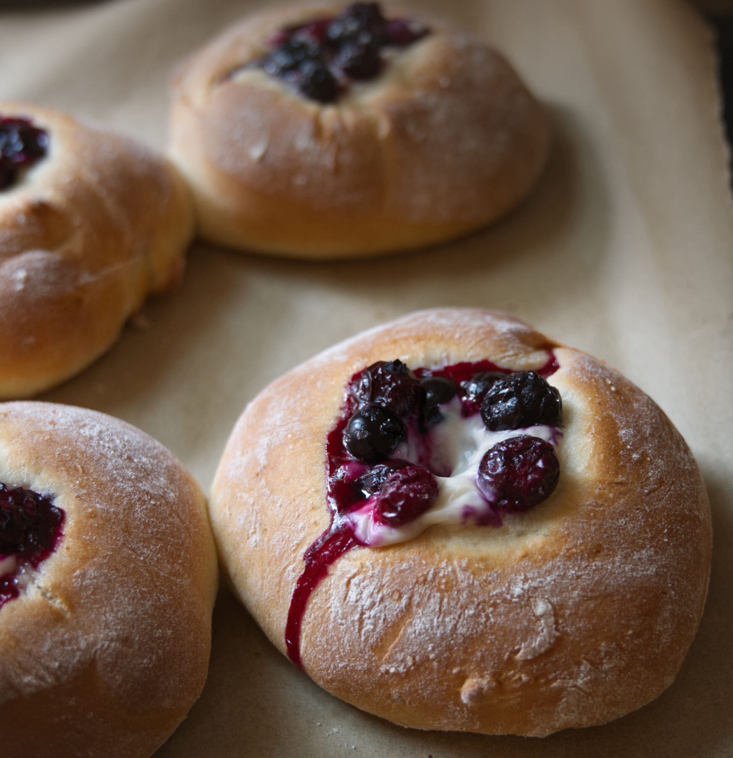 Gently remove the dough from the bowl, knead a couple of times, and divide into 6 pieces. Form 6 individual balls and arrange them on a baking pan lined with oven-safe parchment paper. Be sure to leave plenty of space amongst the buns, as they will grow once in the oven. Press down in the center of the dough balls, either with the back of a ¼ size measuring cup or simply with your fingers, until you touch the bottom of the baking pan. The cream and berries will nestle into these wells, so it’s important to have basins deep enough to avoid spillage during baking. Put 1 abundant tablespoon of yogurt in the well and top with 1 tbsp of blueberries and a sprinkle of sugar, if using any. Cover with a clean towel and set aside for a quick second proof, about 20 minutes.
