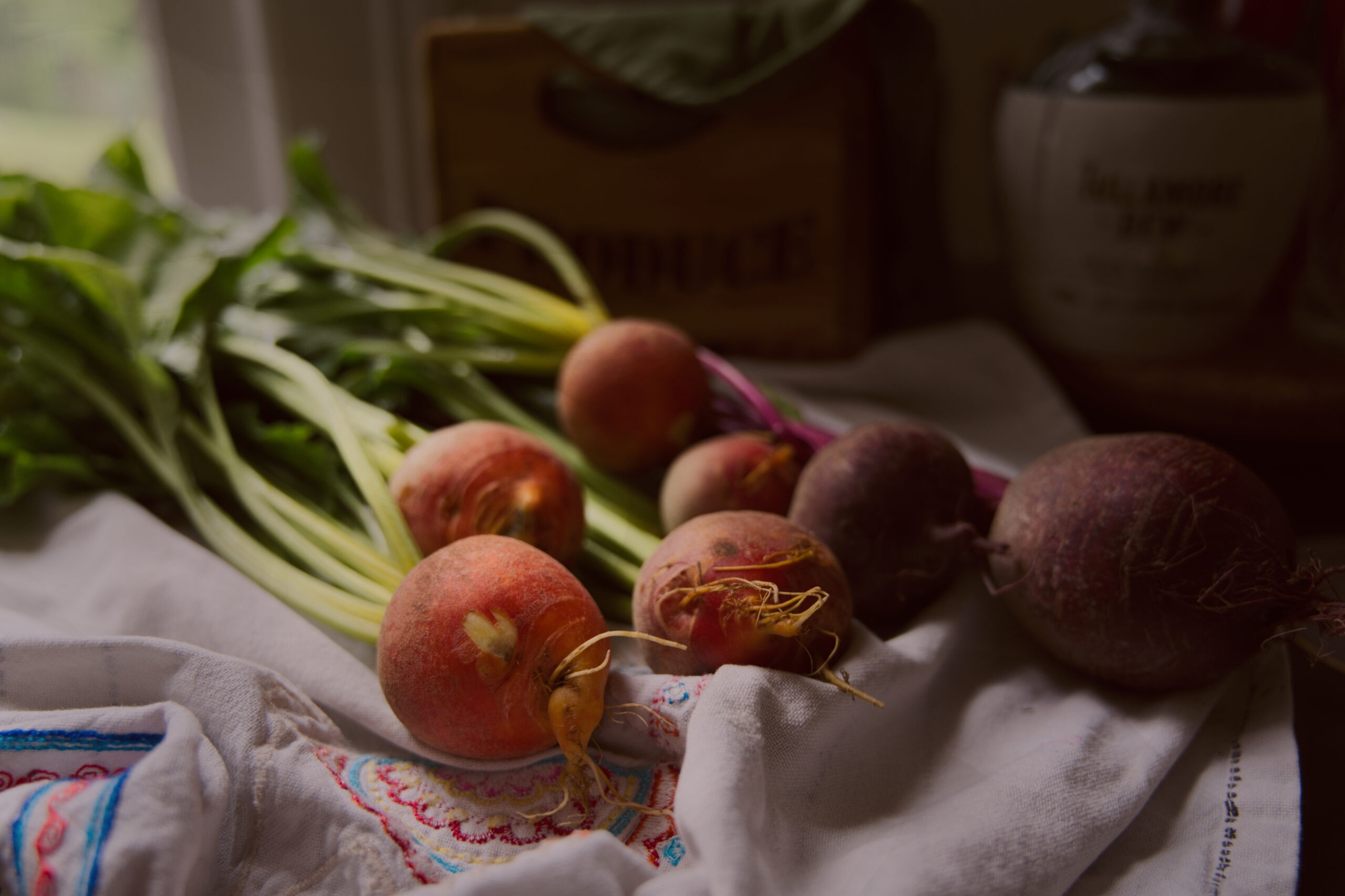 Peel, quarter, and coat the ube and the beets in olive oil. Roast on an oven-safe dish for 18-20 minutes. Let cool before creaming with the legumes.